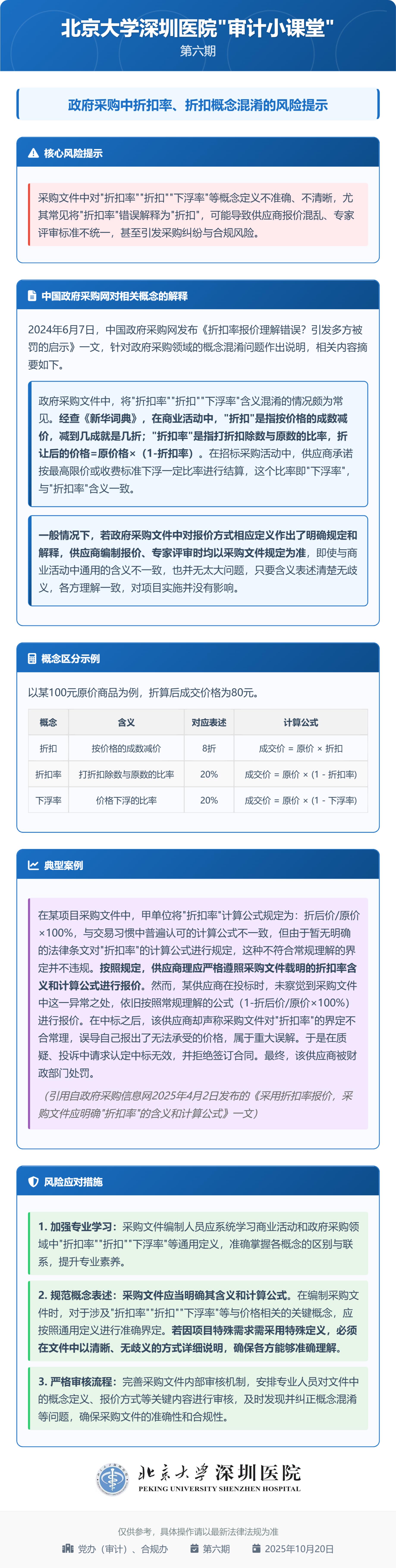 采购文件中对“折扣率”“折扣”“下浮率”等概念定义不准确、不清晰,尤其常见将“折扣率”错误解释为“折扣”,可能导致供应商报价混乱、专家评审标准不统一,甚至引发采购纠纷与合规风险。