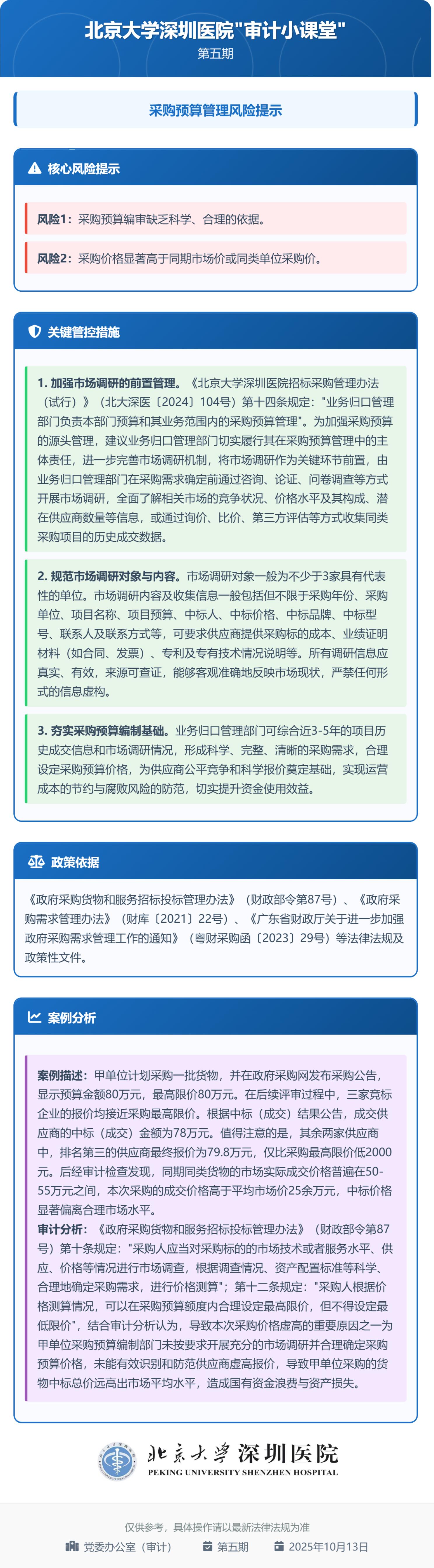 1.加强市场调研的前置管理。《北京大学深圳医院招标采购管理办法(试行)》(北大深医〔2024〕104号)第十四条规定:“业务归口管理部门负责本部门预算和其业务范围内的采购预算管理”。为加强采购预算的源头管理,建议业务归口管理部门切实履行其在采购预算管理中的主体责任,进一步完善市场调研机制,将市场调研作为关键环节前置,由业务归口管理部门在采购需求确定前通过咨询、论证、问卷调查等方式开展市场调研,全面了解相关市场的竞争状况、价格水平及其构成、潜在供应商数量等信息,或通过询价、比价、第三方评估等方式收集同类采购项目的历史成交数据。