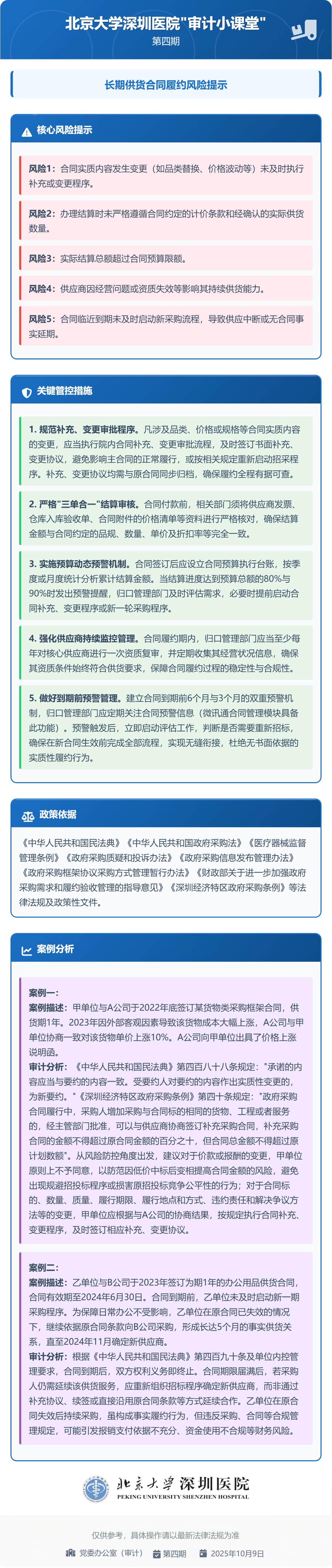 审计分析:根据《中华人民共和国民法典》第四百九十条及单位内控管理要求,合同到期后,双方权利义务即终止。合同期限届满后,若采购人仍需延续该供货服务,应重新组织招标程序确定新供应商,而非通过补充协议、续签或直接沿用原合同条款等方式延续合作。乙单位在原合同失效后持续采购,虽构成事实履约行为,但违反采购、合同等合规管理规定,可能引发报销支付依据不充分、资金使用不合规等财务风险。