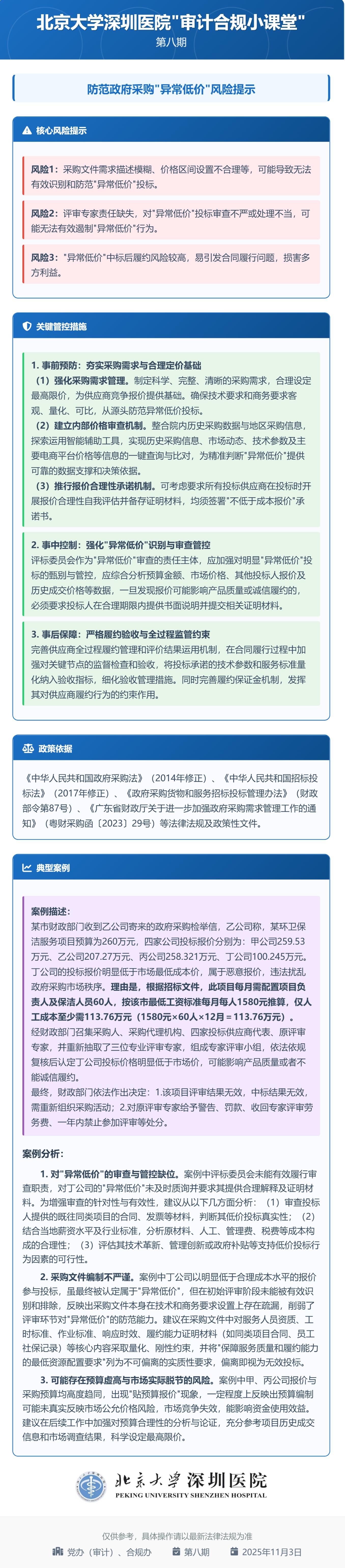 3.可能存在预算虚高与市场实际脱节的风险。案例中甲、丙公司报价与采购预算均高度趋同,出现“贴预算报价”现象,一定程度上反映出预算编制可能未真实反映市场公允价格风险,导致市场竞争失效,影响采购资金使用效益。建议在后续工作中加强对预算合理性的分析与论证,充分参考项目历史成交信息和市场调查结果,科学设定最高限价。
