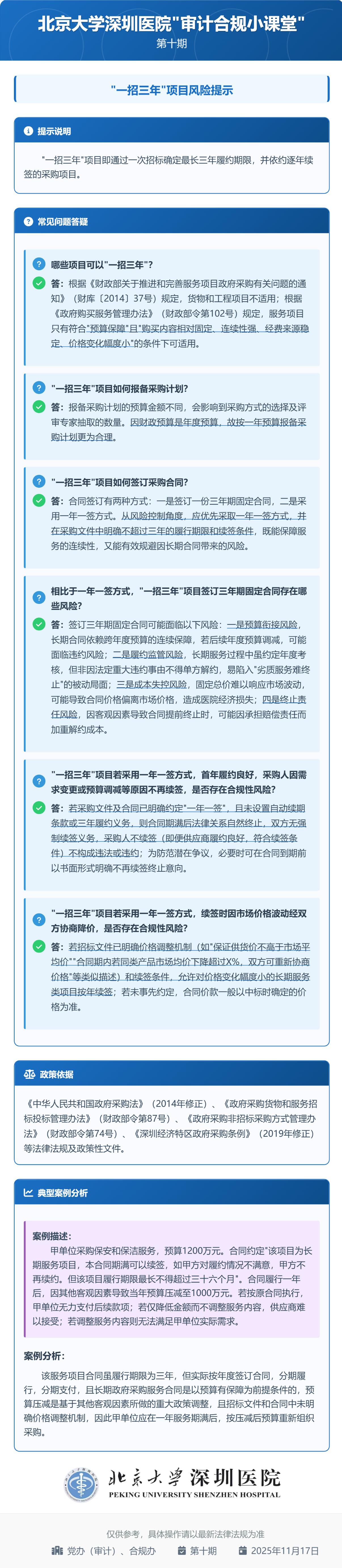 答:签订三年期固定合同可能面临以下风险:一是预算衔接风险,长期合同依赖跨年度预算的连续保障,若后续年度预算调减,可能面临违约风险;二是履约监管风险,长期服务过程中虽约定年度考核,但非因法定重大违约事由不得单方解约,易陷入“劣质服务难终止”的被动局面;三是成本失控风险,固定总价难以响应市场波动,可能导致合同价格偏离市场价格,造成医院经济损失;四是终止责任风险,因客观因素导致合同提前终止时,可能因承担赔偿责任而加重解约成本。