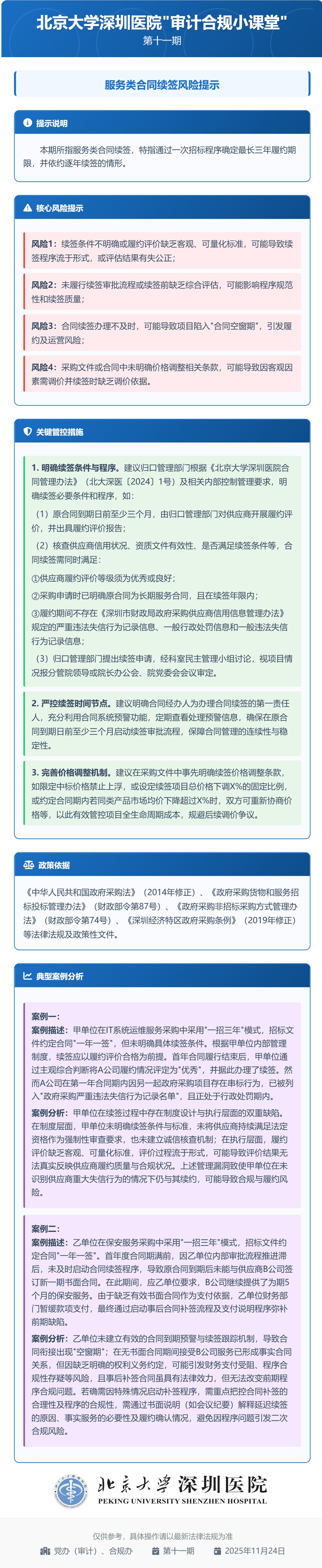 1.明确续签条件与程序。建议归口管理部门根据《北京大学深圳医院合同管理办法》(北大深医〔2024〕1号)及相关内部控制管理要求,明确续签必要条件和程序,如:(1)原合同到期日前至少三个月,由归口管理部门对供应商开展履约评价,并出具履约评价报告;(2)核查供应商信用状况、资质文件有效性、是否满足续签条件等,合同续签需同时满足①供应商履约评价等级须为优秀或良好;②采购申请时已明确原合同为长期服务合同,且在续签年限内;③履约期间不存在《深圳市财政局政府采购供应商信用信息管理办法》规定的严重违法失信行为记录信息、一般行政处罚信息和一般违法失信行为记录信息;(3)归口管理部门提出续签申请,经科室民主管理小组讨论,视项目情况报分管院领导或院长办公会、院党委会会议审定。