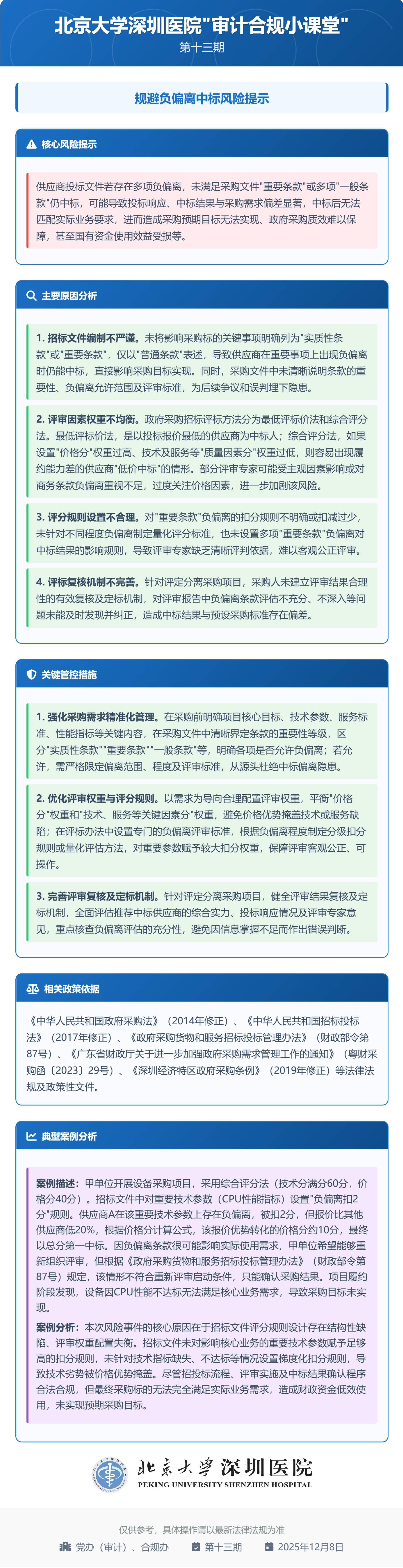 案例分析:本次风险事件的核心原因在于招标文件评分规则设计存在结构性缺陷、评审权重配置失衡。招标文件未对影响核心业务的重要技术参数赋予足够高的扣分规则,未针对技术指标缺失、不达标等情况设置梯度化扣分规则,导致技术劣势被价格优势掩盖。尽管招投标流程、评审实施及中标结果确认程序合法合规,但最终采购标的无法完全满足实际业务需求,造成财政资金低效使用,未实现预期采购目标。