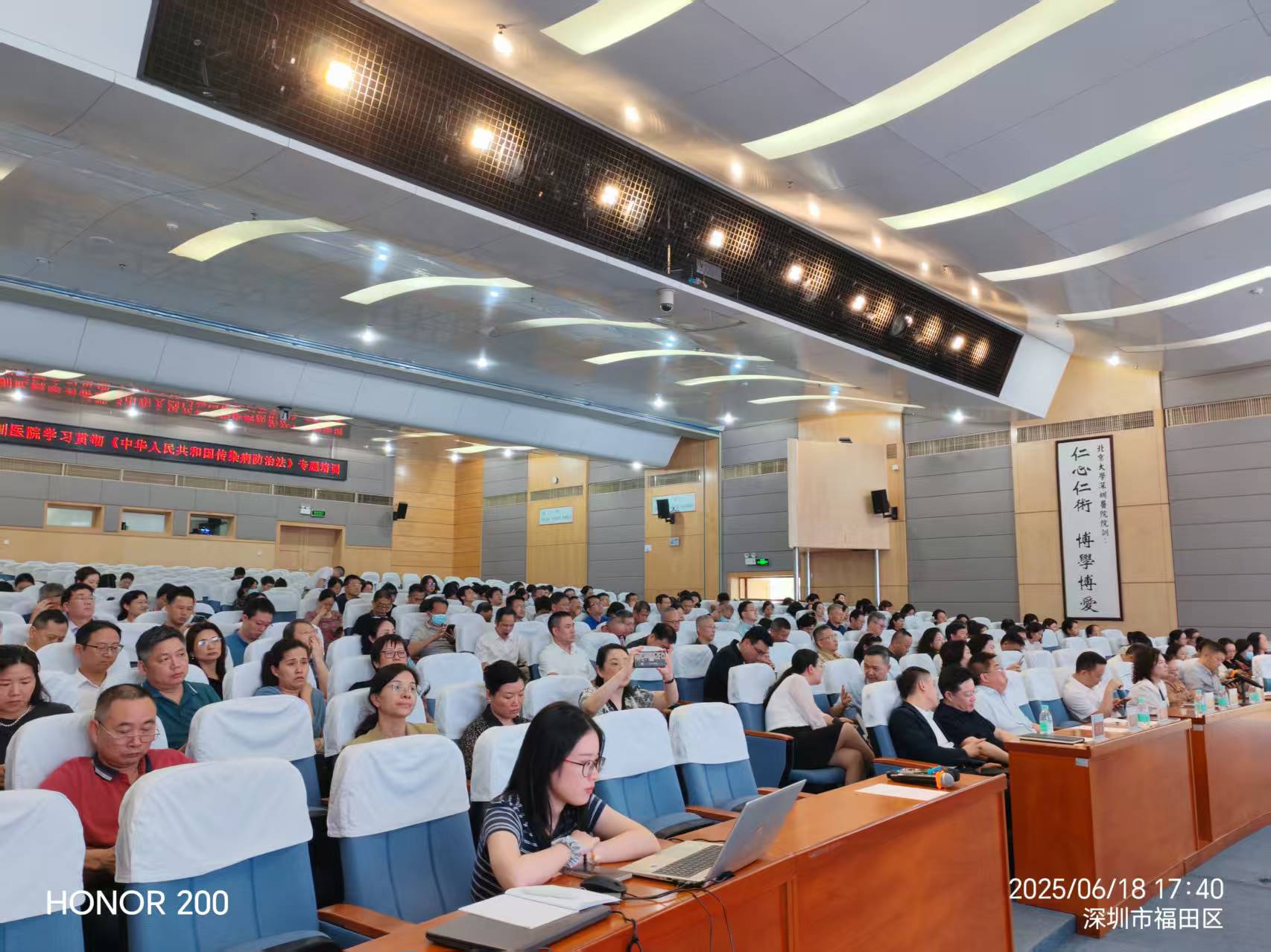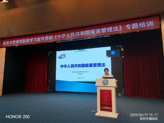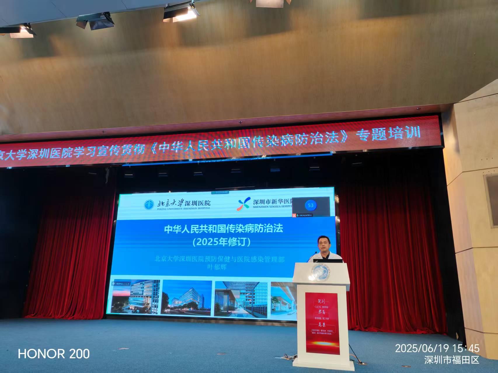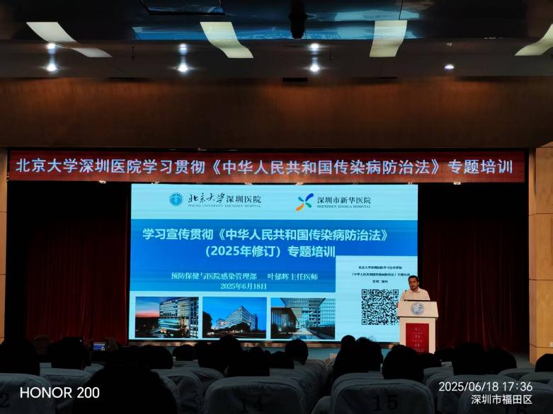2025 年 6 月 18 日至 19 日,为全面提升医务人员传染病防治法律知识,北京大学深圳医院联合开展《中华人民共和国传染病防治法》专题培训,深入学习了《中华人民共和国传染病防治法(2025 年修订版)》,同时邀请福田区疾病预防控制中心专家进行了授课。