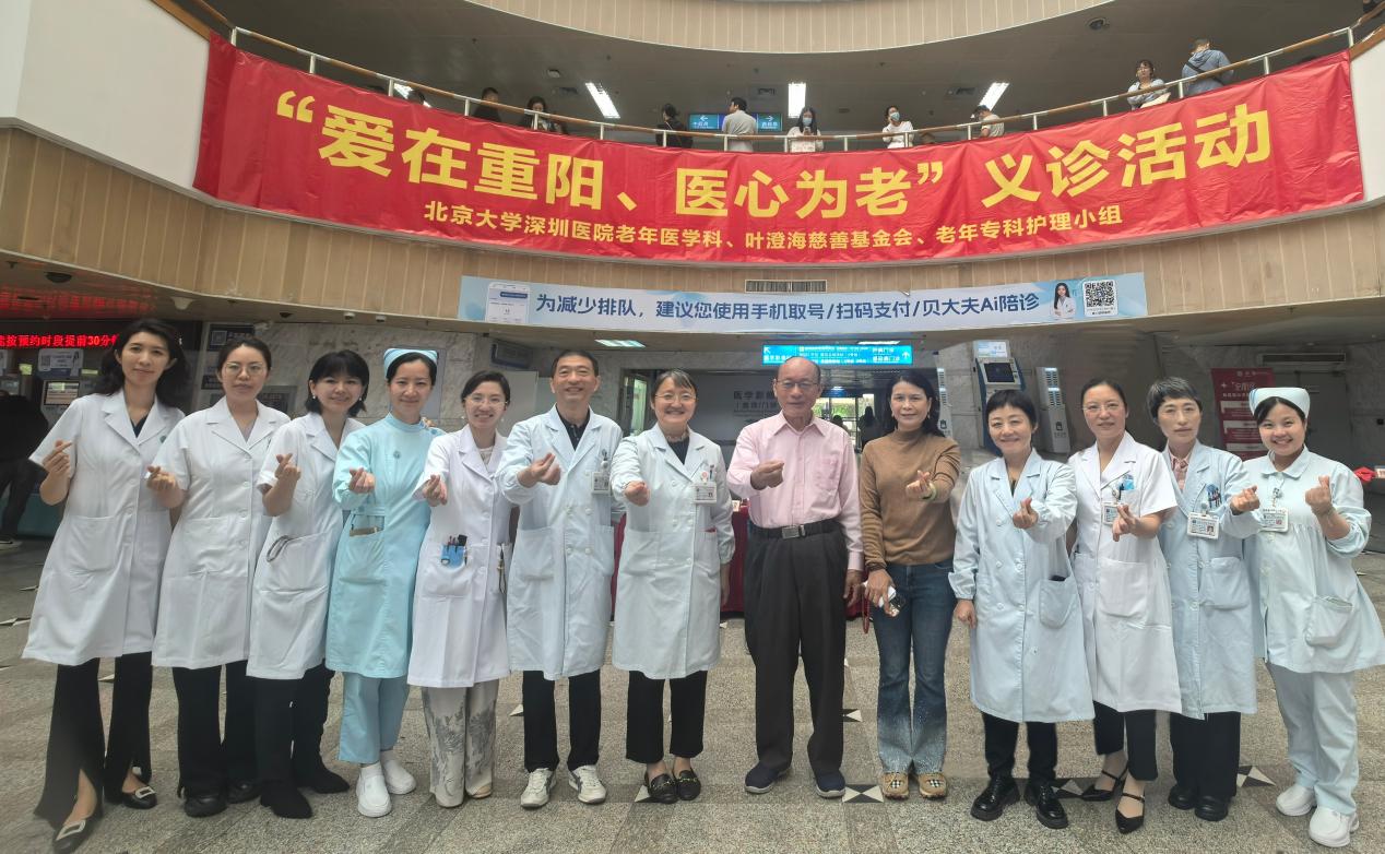 2025年10月29日农历九月初九是中国的重阳节,又称“敬老节”。为了弘扬中华民族尊老爱老助老的传统美德,重阳节当天,老年医学科、老年专科护理小组联合在北京大学深圳医院门诊一楼大厅举行了主题为“爱在重阳、医心为老”义诊活动,前来义诊的老人络绎不绝。此次活动由老年医学科、营养科、运动医学科、药剂科的医生代表以及老年护理专科小组、叶澄海慈善基金会工作人员参加。