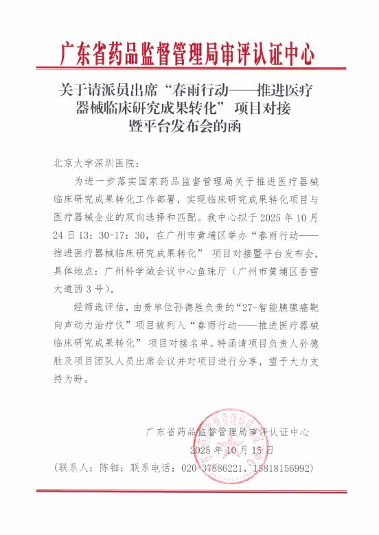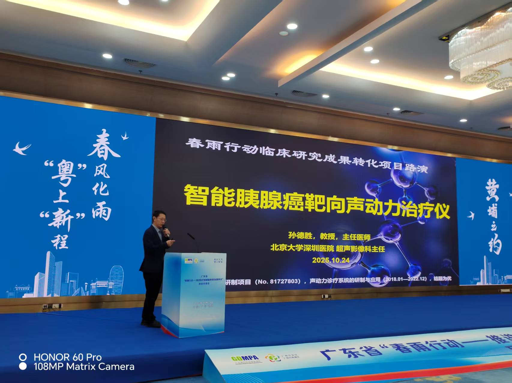 10月24日,广东省“春雨行动——推进医疗器械临床研究成果转化”项目对接会在广州黄埔区成功举行。此次对接会经过两轮严格遴选,从全省413项成果中甄选出20个入围项目。由 北京大学深圳医院超声影像科孙德胜主任团队研发的 “智能胰腺癌靶向声动力治疗仪” 脱颖而出,成为深圳市唯一入围项目,并经省药检局组织专家评定为三类全国性创新项目,成为本次对接会的“高新尖”代表之一。据悉,该创新成果也将为破解胰腺癌治疗困境提供了全新方向。
