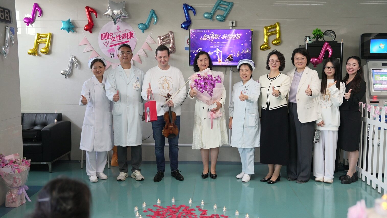 Pronin教授再次献上精心挑选的曲目,并在结束后应热烈掌声加演了一曲巴赫《D小调第二无伴奏小提琴组曲:恰空》。科室主任向教授赠送了蝴蝶兰等礼物,象征医艺相融、温暖共伴,为活动画上圆满句号。这不仅仅是一场演出,更是一次跨越病痛的心灵对话。
