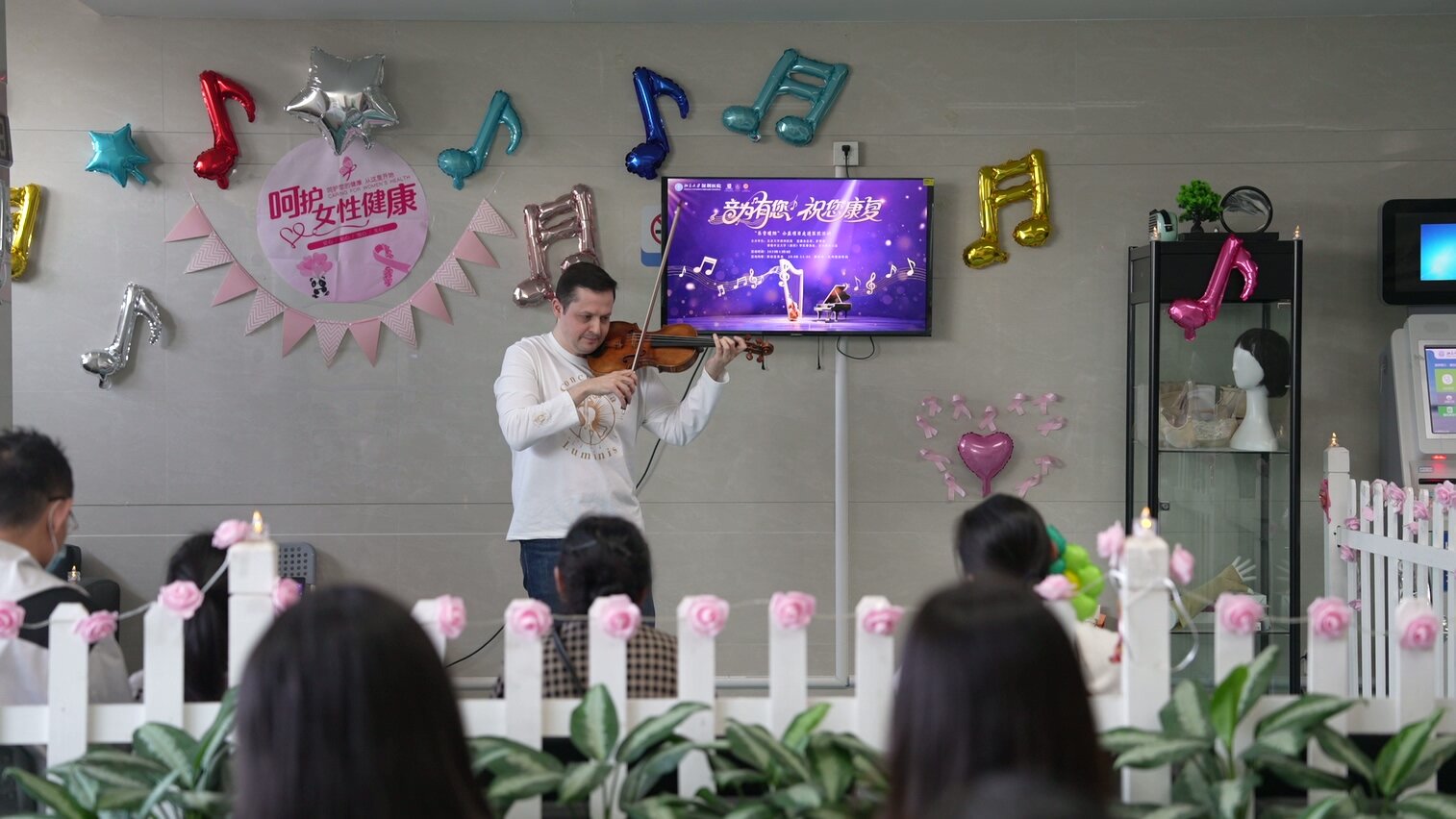 上午10时15分,活动率先在肿瘤科日间病房拉开帷幕。党委办公室主任赵羚谷率先致辞,深刻阐释了人文关怀与医疗服务的融合之道,描绘了充满温度的人文医疗愿景。国际知名小提琴家Stanislav Pronin教授简要分享了音乐在医疗环境中的疗愈作用。他温润有力的话语为活动奠定了温暖基调。