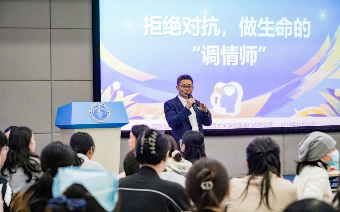 2024年12月10日,由深圳市门诊质量控制中心组织,北京大学深圳医院承办的第五期门诊话术工作坊在北京大学深圳医院综合楼学术报告厅顺利召开,全市各大医疗机构的门诊管理者、医护人员及负责门诊患者投诉调解工作的同仁共计120余人参与。本期主题是“拒绝对抗,做生命的调情师”。活动邀请了深圳市门诊质控中心陈春涛主任、北京大学深圳医院护理部李九群主任与深圳市口腔医院门诊部罗纬主任出席。本次活动由深圳市门诊质控中心委员、北京大学深圳医院门诊部孟作为护士长主持。