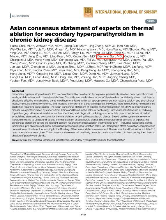 医疗技术的安全、规范应用离不开标准的指引。值得一提的是,在2025年《亚洲专家共识声明:慢性肾病继发性甲状旁腺功能亢进的热消融治疗》和《继发性甲状旁腺功能亢进热消融治疗专家共识》(以下简称《共识》)中,孙德胜作为核心专家参与了编写工作。
